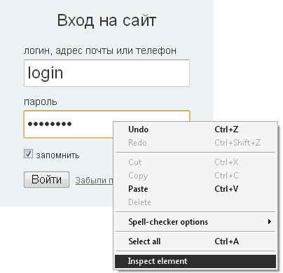 Շատ են պատահում դեպքեր երբ պատահաբար սեղմում եք հիշել գաղտնաբառը և հաջորդ անգամ այդ կայքը այցելելիս տեսնում եք ձեր գաղտնաբառը գրված կետերի կամ աստղանիշերի տեսքով: Պարզվում է այն հնարավոր է կարդալ: Բերված տողում, որտեղ գրված է <input id="field_password" maxlength="50" name="st.password" value=''tabindex="2" class="it it__promo" type="password" size="20"> երրորդ password բառի փոխարեն գրեք text և սեղմեք enter, վորից հետո կտեսնեք գաղնաբառը: